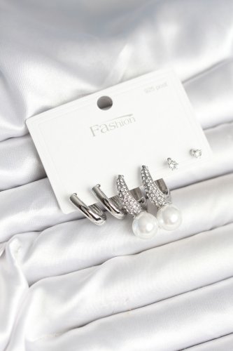 Pirinç Gümüş Renk İncili 925 Ayar Gümüş Çivi Kadın Küpe Seti