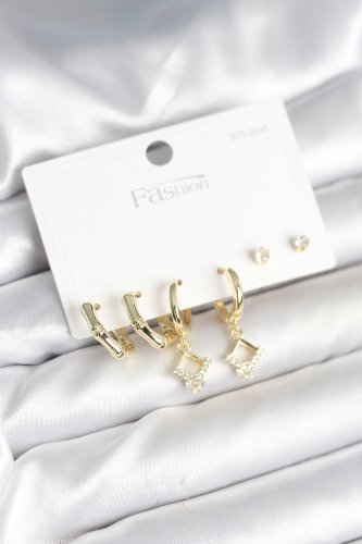 • Pirinç Gold Renk 925 Ayar Gümüş Çivili Kadın Küpe Seti