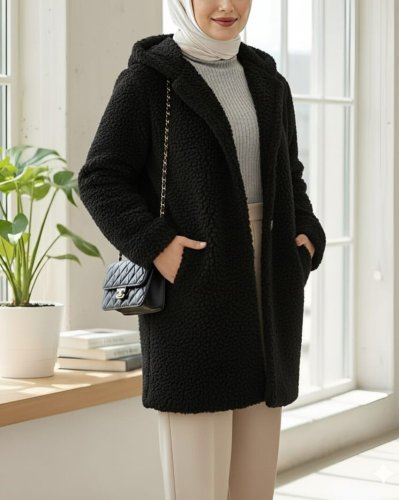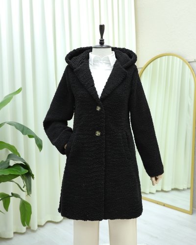 • Kapşonlu Düğmeli Astarlı Peluş Kaban Siyah