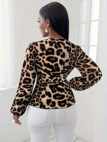 • Kadın uzun kollu kruvaze yakalı belden kuşaklı leopar desenli süprem bluz