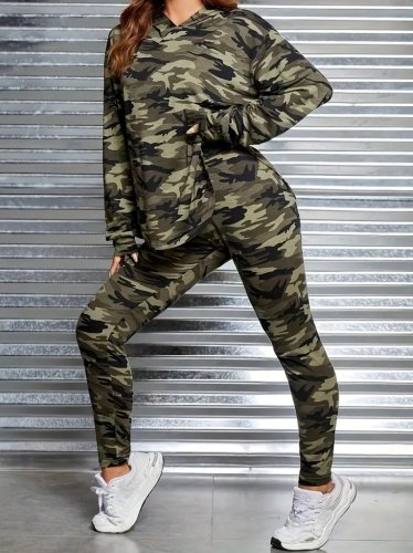 • Kadın uzun kollu kapşonlu kamuflaj desenli bluz ve pantolon tayt ikili takım