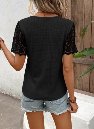 • Kadın kısa kollu v yakalı önden düğmeli dantel detaylı waffle bluz