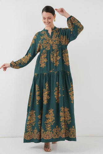 • Zümrüt Yeşili Gold Desenli Tesettür Elbise 2423