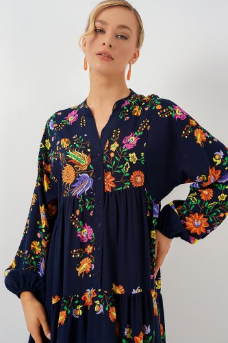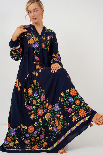 2423 Otantik Desenli Tesettür Elbise Düz Lacivert