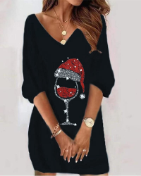 • Kadın uzun kollu siyah V yaka şapka baskılı siyah dalgıç kumaş elbise