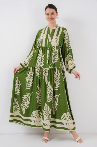 2423 Otantik Desenli Tesettür Elbise Yeşil 5
